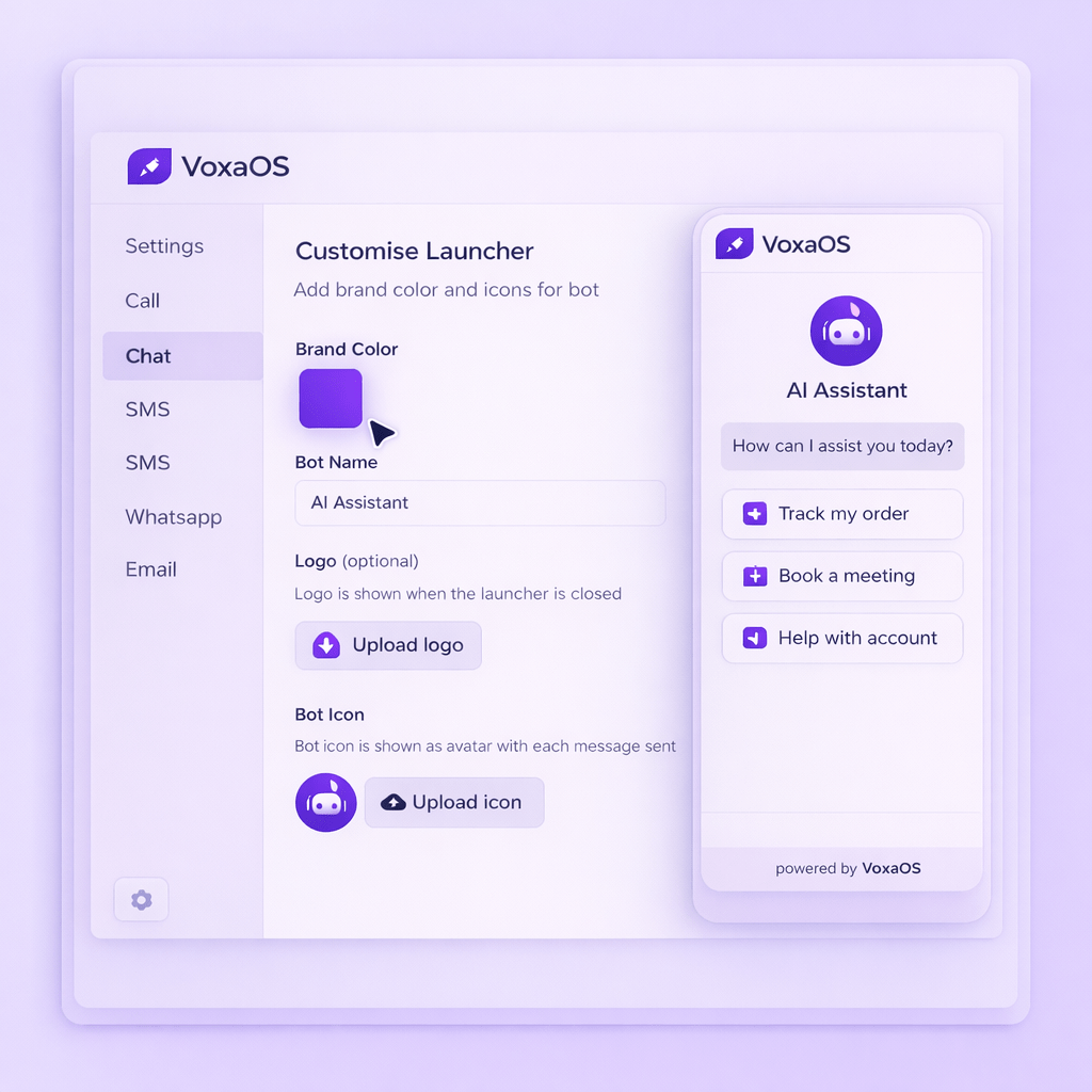 Design your VoxaOS chat widget to match your brand identity with custom colors, logo, and styling — delivering a consistent and polished user experience.