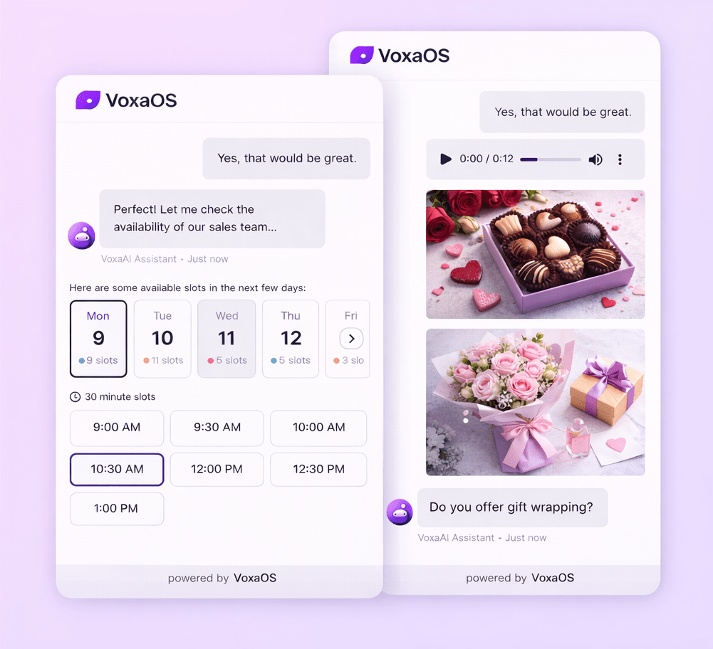 VoxaOS handles text, images, videos, sliders, action buttons, quick replies, forms, and file sharing — creating immersive and responsive customer conversations.